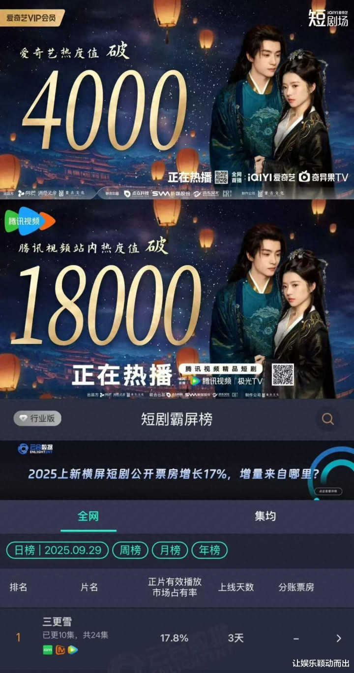 该剧一开播便排面拉满,爱腾芒三平台同播,爱奇艺还上线了剧名专题页与首页推荐。开播首日,《三更雪》爱奇艺热度4000+,登飙升榜第一,腾讯视频热度18000+。开播三天,该剧在抖音上的相关话题已有6亿+播放量,在云合短剧榜的市占率从12.5%上升至17.8%,实现断层领先。